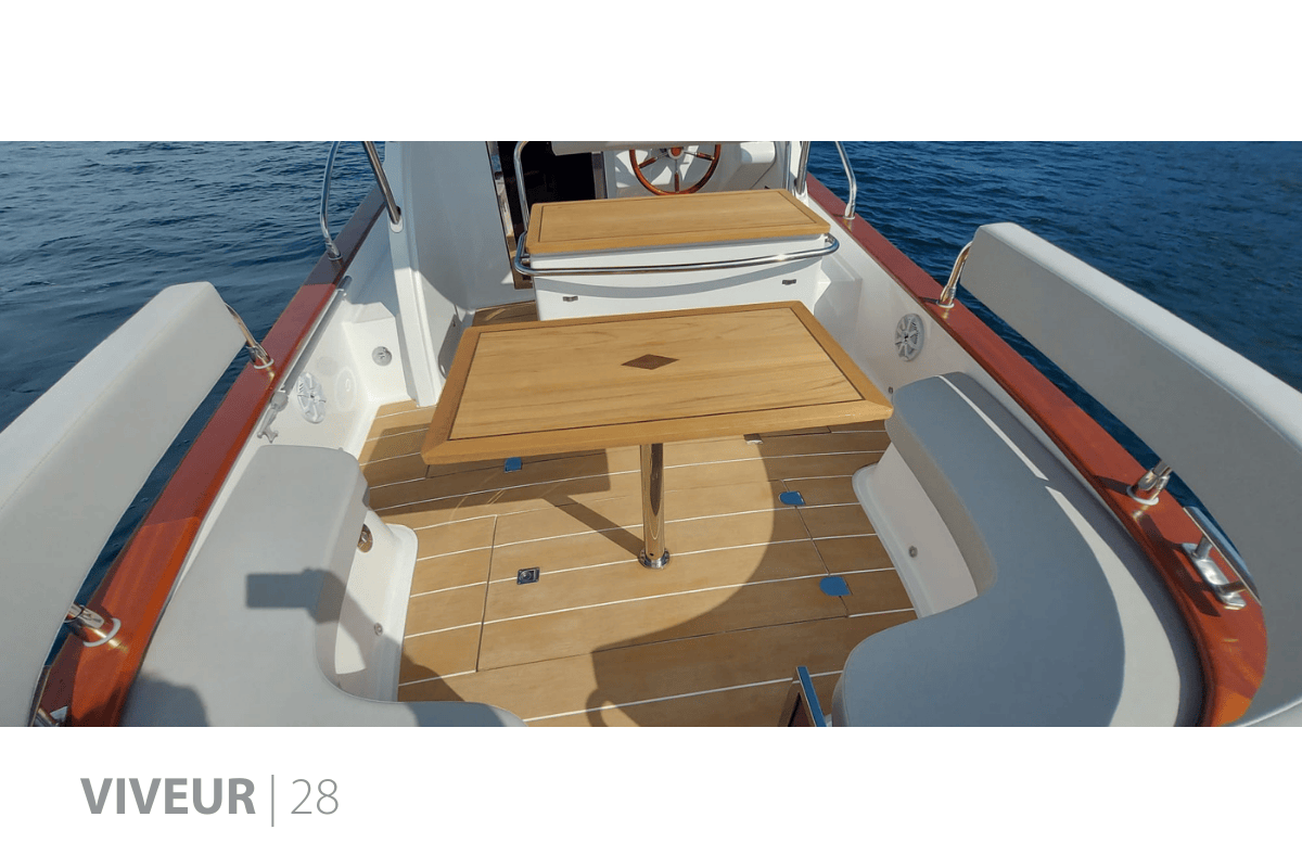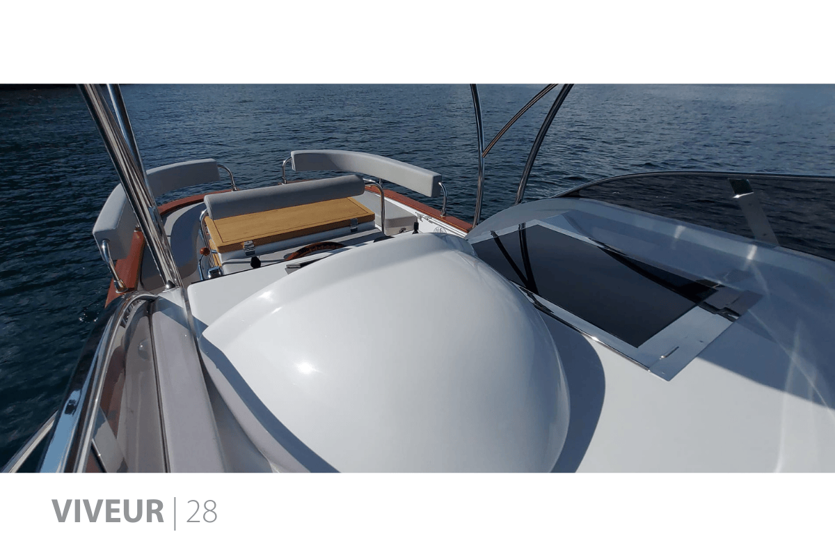 Con una velocità massima di 29 nodi, il VIVEUR 28 unisce linee moderne ed eleganza senza tempo, completato da un’ampia plancetta bagno in acciaio inox.